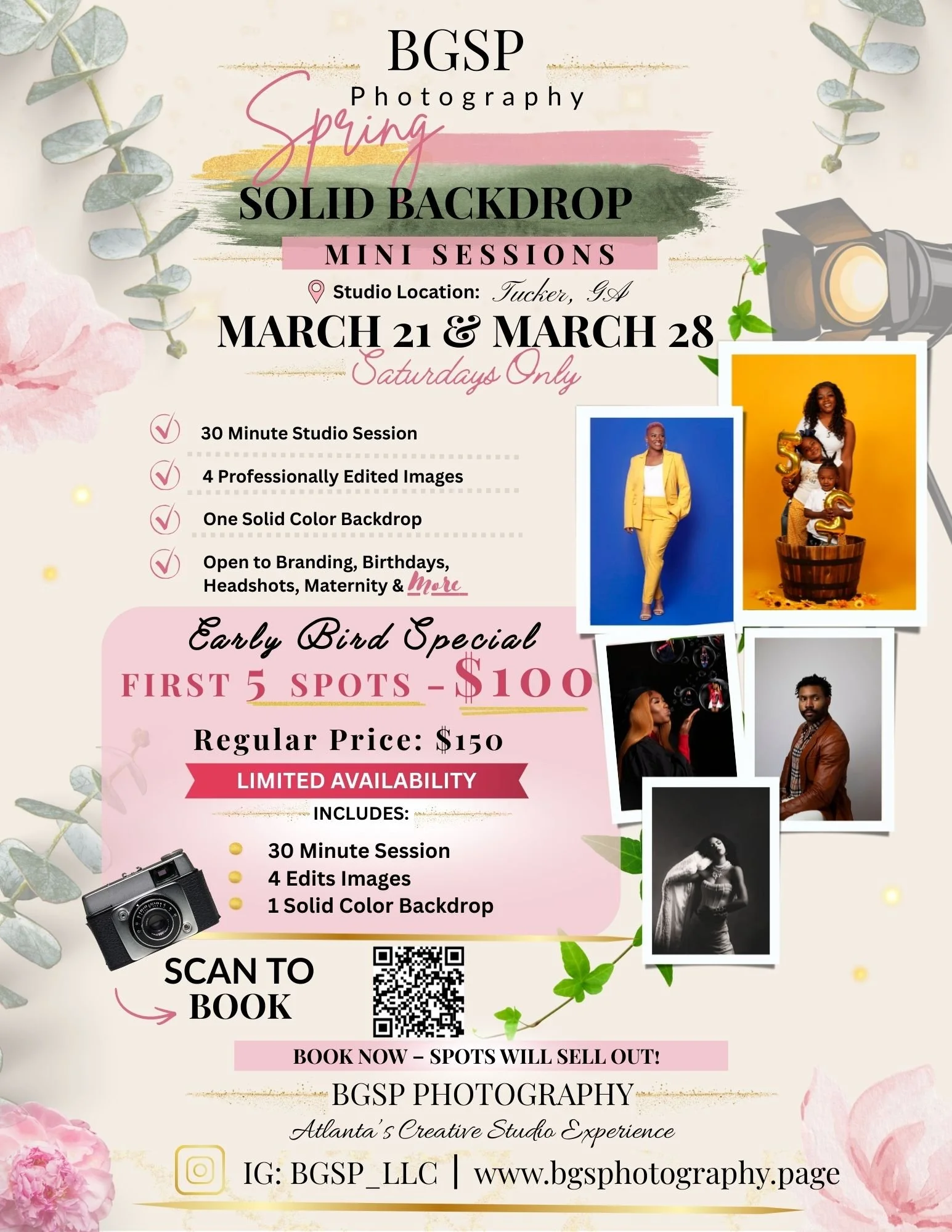Our Solid Backdrop Mini Sessions are perfect for headshots, branding, birthdays, maternity, and more.
